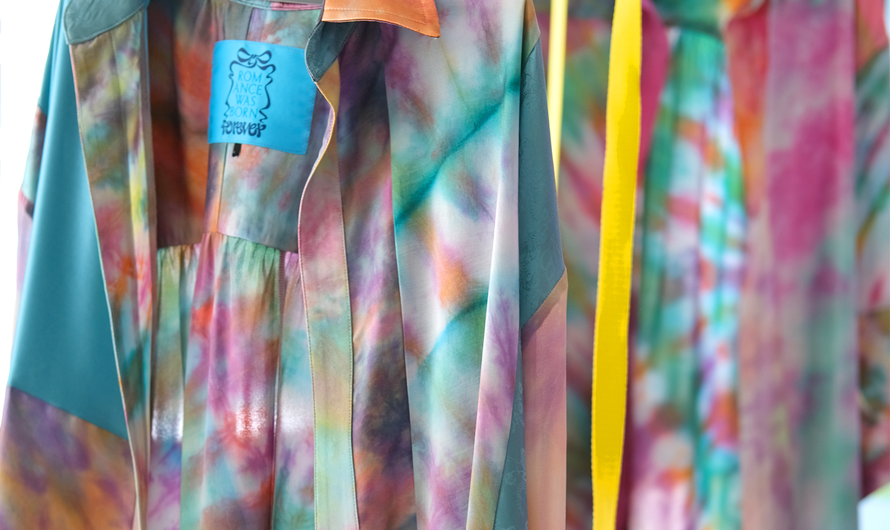 “The Romance Was Born x Future From Waste Lab capsule is a natural progression of concepts from our RWB Forever collection launched in 2021. Where we sourced and transformed vintage pieces and fabrics; like 80’s sequin tops made into one-off party frocks and wedding gowns. For the Future From Waste Lab capsule we continue to favour the techniques we love, like patchwork off-cuts fashioned into cropped biker jackets, crochet table cloth dresses, and using leftover beaded remnants embellished onto opera cape inspired shapes. Our rainbow coloured “art-dye” is having a little moment here too. As well as the familiar, we are excited to experiment with some new techniques, like indigo over-dyed and tie-dyed discarded cotton business shirts and cotton bedsheets from Upparel in Melbourne. This jumble of deconstructed indigo shirts and bedsheets will feature as breezy summer dresses and light apron blouse tops. Also, especially for the FFWL collab we are going to try something special with vintage wool blankets. This collaboration is a celebration of techniques that have become fundamental to the Romance Was Born process, our design is always inspired by nostalgia, memories of growing up, reusing vintage pieces and found fabrics.” – Anna Plunkett, Romance Was Born co-founder.